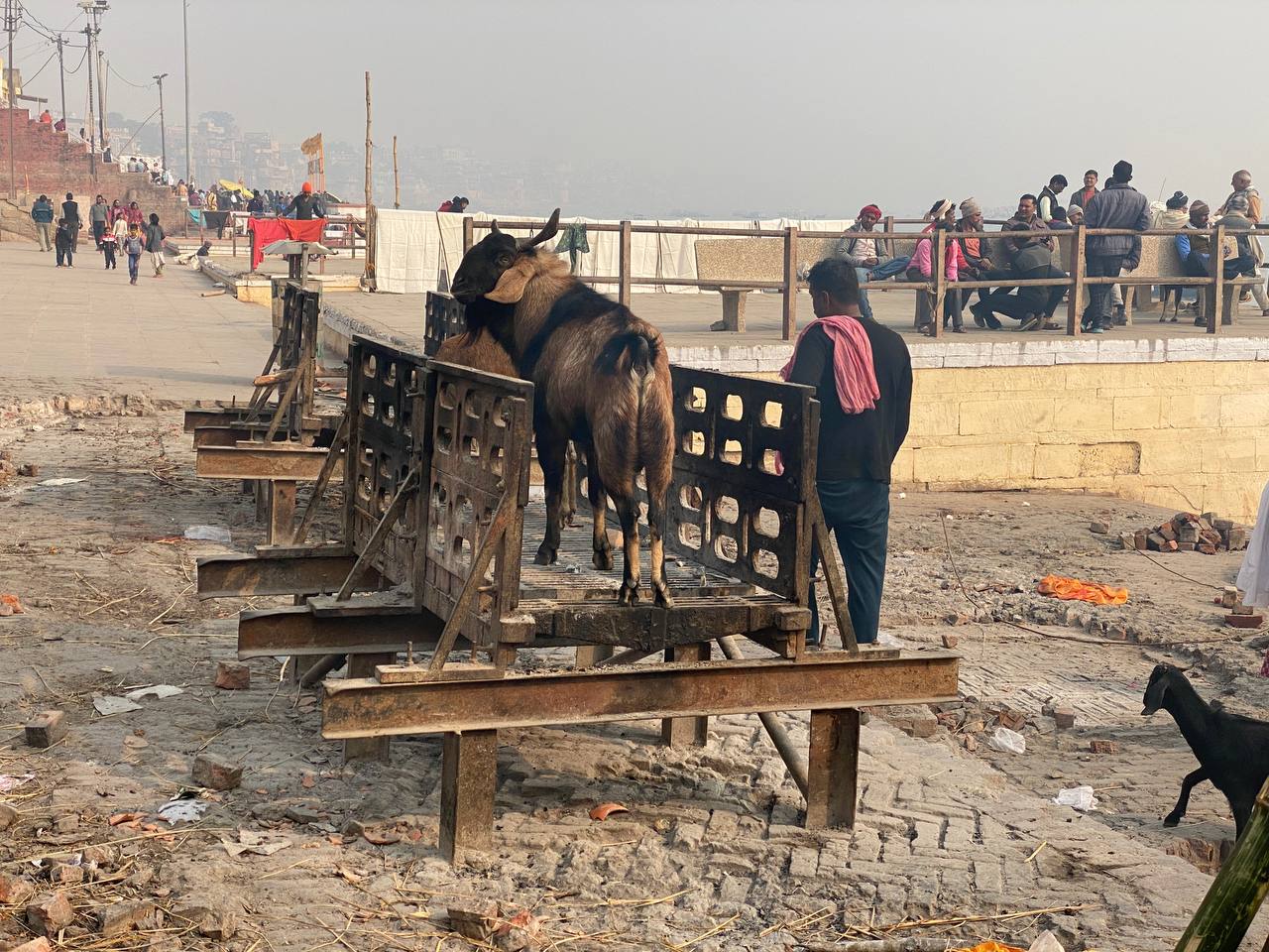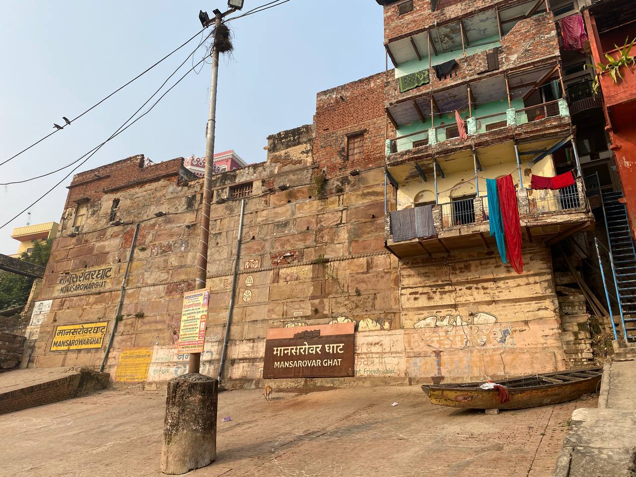 У некоторых Гхатов установлены помосты для кремации умерших и запасено большое количество дров. Хоть огонь и горел, но никого не сжигали. Ритуал сжигания у берега Ганги очень важный для некоторых индуистов. Но не всем эта церемония доступна, так как и, привлекаются брамины, используется 250 кг дров и требуется время и усилия, чтобы доставить тело в Варанаси.»