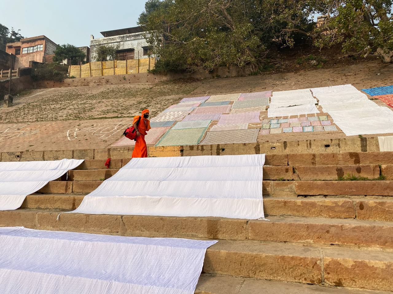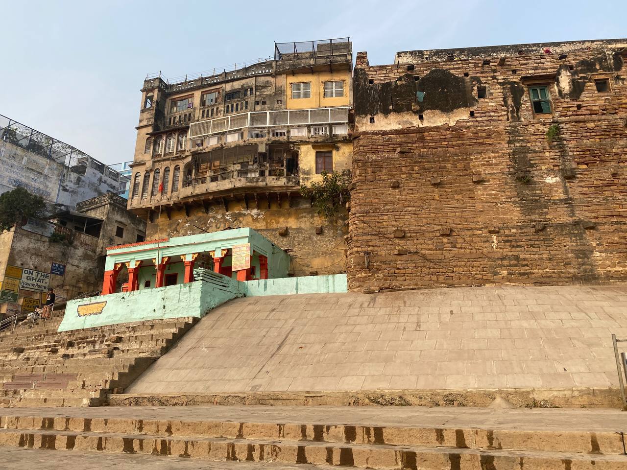 На «этом» же берегу Ганги находятся Гхаты. Это крепости или древние красивые здания. Возраст их не определить на взгляд, но некоторые, действительно, построены давно. На вид они все очень древние, как я понял, Гхатов больше 80 стоят они плотно один к другому и у некоторых люди одетые в обычную и традиционную одежду, одежды паломников, нищих, браминов: